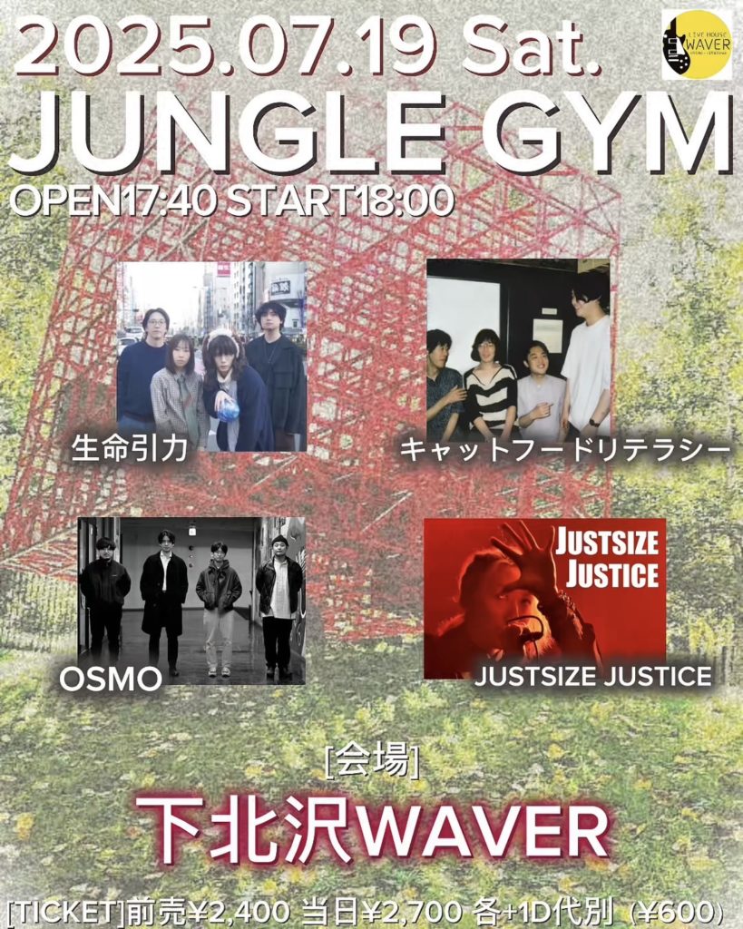 2025年6月22日 / 最終更新日時 : 2025年7月3日 ひとみ笹原 2025年07月 2025年07月19日(土)《night》 『JUNGLE GYM』 生命引力/キャットフードリテラシー/OSMO/JUSTSIZE JUSTICE 17:40 / 18:00 adv¥2,400 / door¥2,700 各+drink代別 / streaming¥2,000 streaming ticketはこちらをご覧下さい。 FacebookXBlueskyHatenaCopy