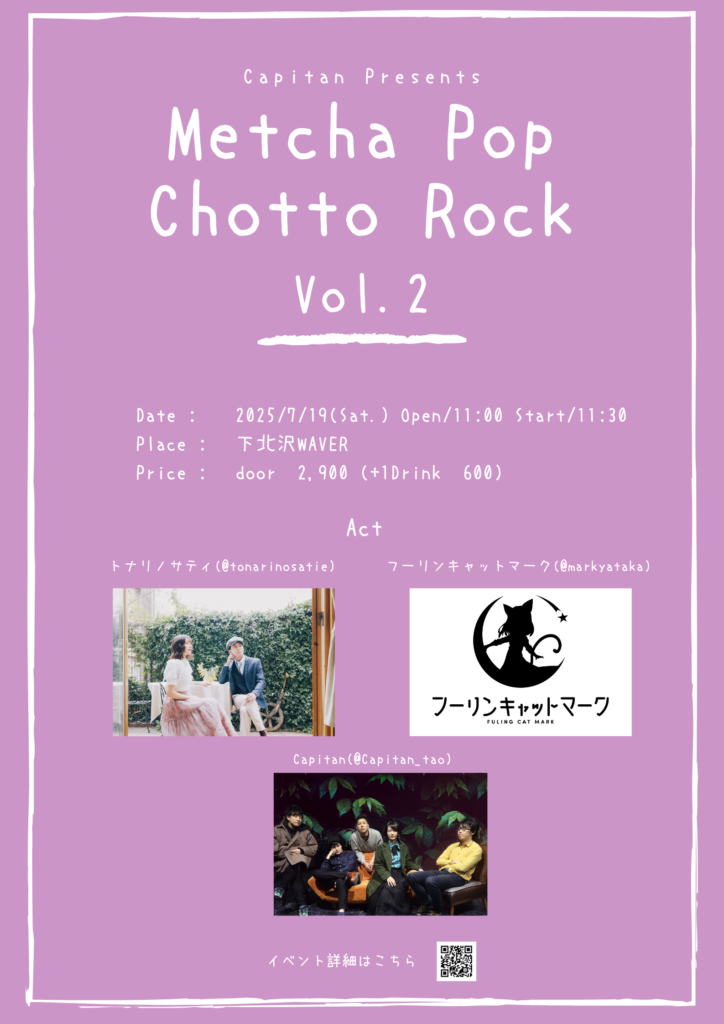 2025年6月22日 / 最終更新日時 : 2025年6月22日 ひとみ笹原 2025年07月 2025年07月19日(土)《day》 Capitan Presents『Metcha Pop Chotto Rock vol.2』 Capitan/フーリンキャットマーク/トナリノサティ 11:00 / 11:30 door¥2,900 +drink代別 FacebookXBlueskyHatenaCopy