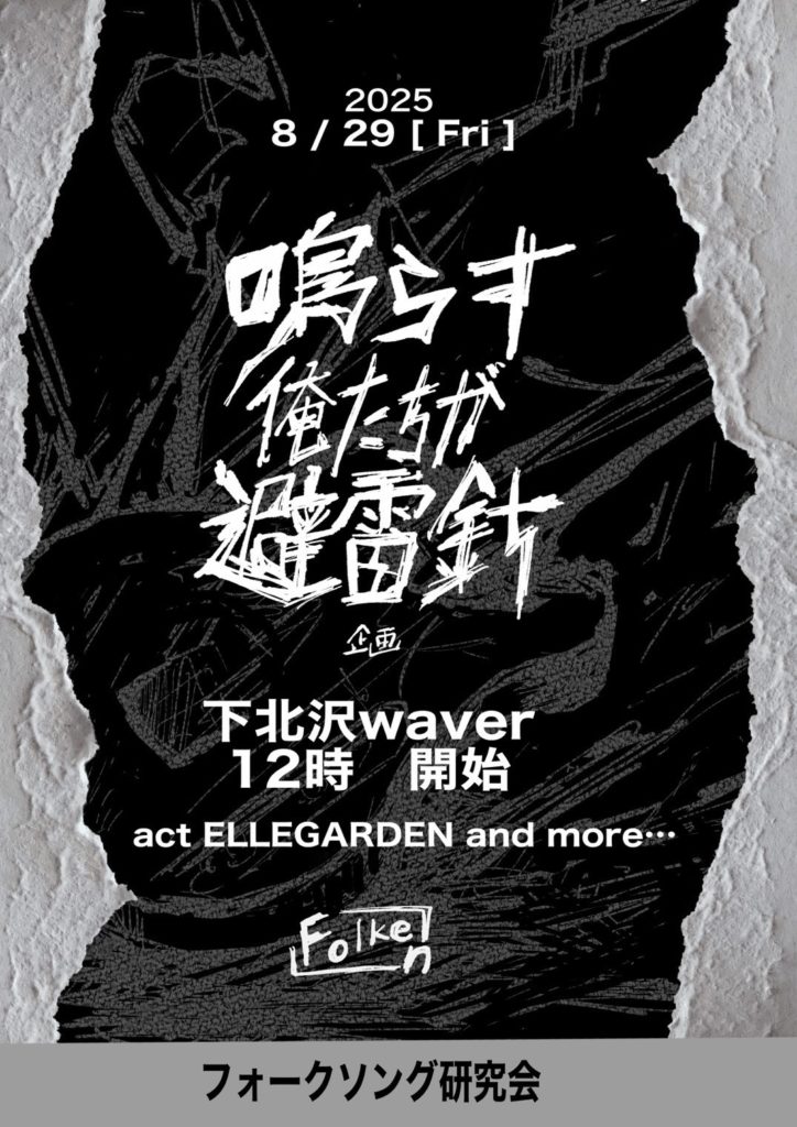 2025年8月2日 / 最終更新日時 : 2025年8月28日 ひとみ笹原 2025年08月 2025年08月29日(金) 専修大学 フォークソング研究会『鳴らす俺たちが避雷針』 11:45 / 12:00 door¥FREE +drink代別 FacebookXBlueskyHatenaCopy