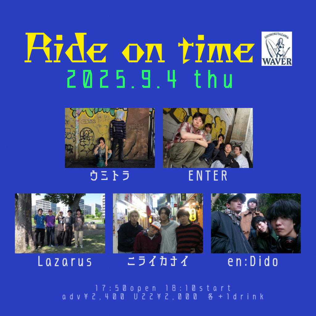 2025年8月9日 / 最終更新日時 : 2025年8月17日 ひとみ笹原 2025年09月 2025年09月04日(木) 『Ride on time』 ウミトラ/en:Dido/ENTER/ニライカナイ/Lazarus 17:50 / 18:10 adv¥2,400 / door¥2,700 / U22¥2,000 各+drink代別 FacebookXBlueskyHatenaCopy
