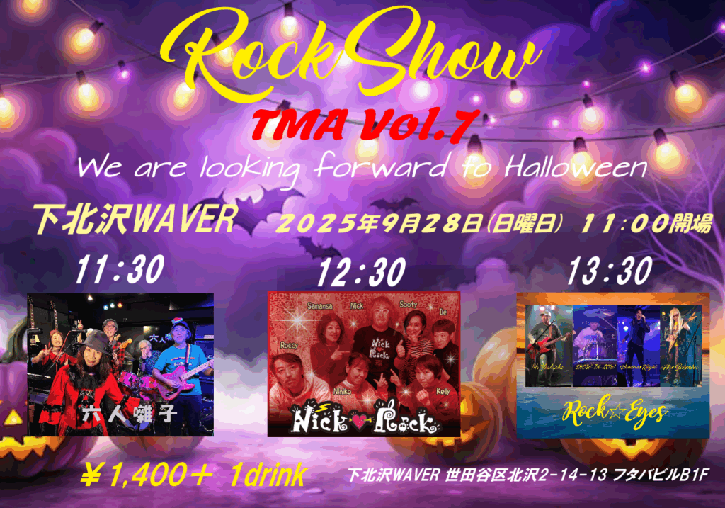 2025年8月17日 / 最終更新日時 : 2025年8月17日 ひとみ笹原 2025年09月 2025年09月28日(日)《day》 『TMA vol.7』 六人囃子/Nick Rock/Rock☆Eyes 11:00 / 11:30 adv¥1,400 / door¥1,400 各+drink代別 FacebookXBlueskyHatenaCopy