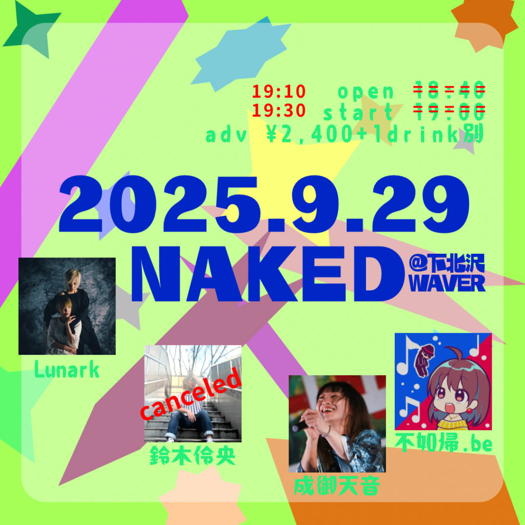 2025年8月17日 / 最終更新日時 : 2025年9月27日 ひとみ笹原 2025年09月 2025年09月29日(月) 『NAKED』 成御天音/不如帰.be/Lunark ※鈴木怜央は体調不良によりキャンセルとなりました。(09/27現在) 19:10 / 19:30 adv¥2,400 / door¥3,000 各+drink代別 FacebookXBlueskyHatenaCopy