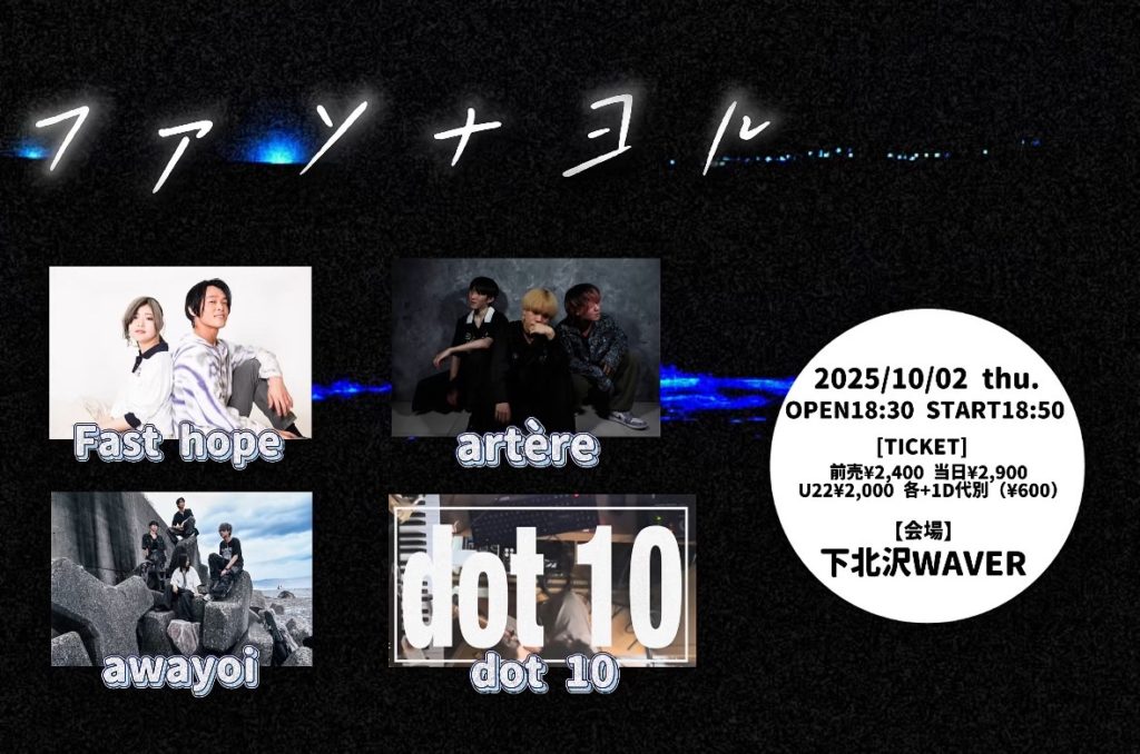 2025年9月1日 / 最終更新日時 : 2025年9月1日 ひとみ笹原 2025年10月 2025年10月02日(木) 『フアソナヨル』 Fast hope/artère/awayoi/dot 10 18:30 / 18:50 adv¥2,400 / door¥2,900 / U22¥2,000 各+drink代別 FacebookXBlueskyHatenaCopy