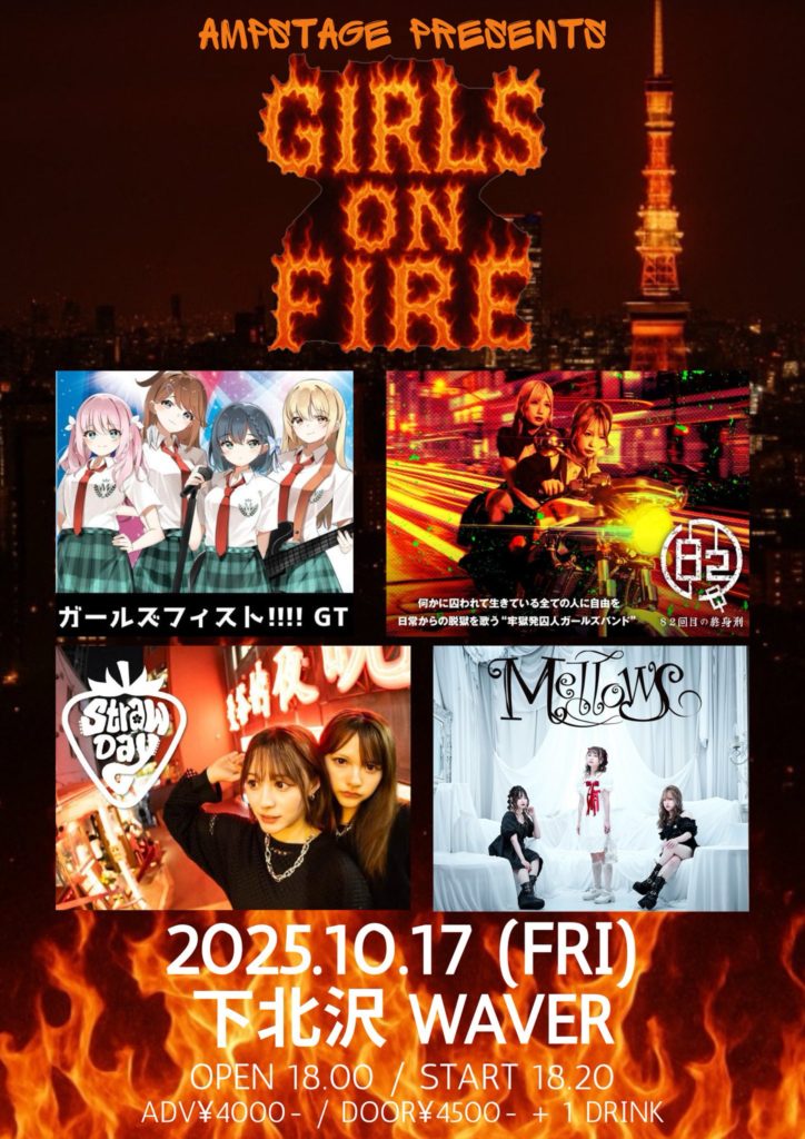 2025年9月2日 / 最終更新日時 : 2025年9月2日 ひとみ笹原 2025年10月 2025年10月17日(金) AMPSTAGE PRESENTS『GIRLS ON FIRE』 STRAWDAY/82回目の終身刑/Mellows/ガールズフィスト!!!!GT 18:00 / 18:20 adv¥4,000 / door¥4,500 各+drink代別 ticketはこちらをご覧下さい。 FacebookXBlueskyHatenaCopy