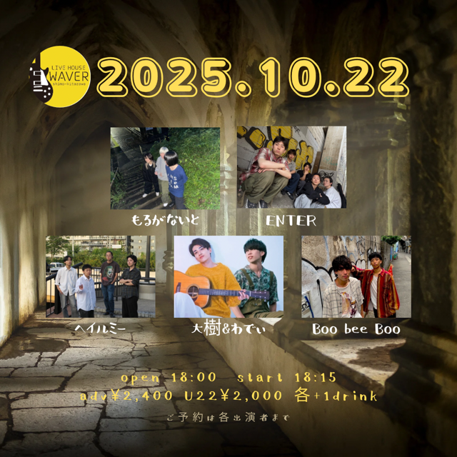 2025年9月2日 / 最終更新日時 : 2025年9月16日 ひとみ笹原 2025年10月 2025年10月22日(水) 『GUILD』 もるがないと/大樹&わでぃ/Boo bee Boo/ヘイルミー/ENTER 18:00 / 18:15 adv¥2,400 / door¥2,700 / U22¥2,000 各+drink代別 FacebookXBlueskyHatenaCopy