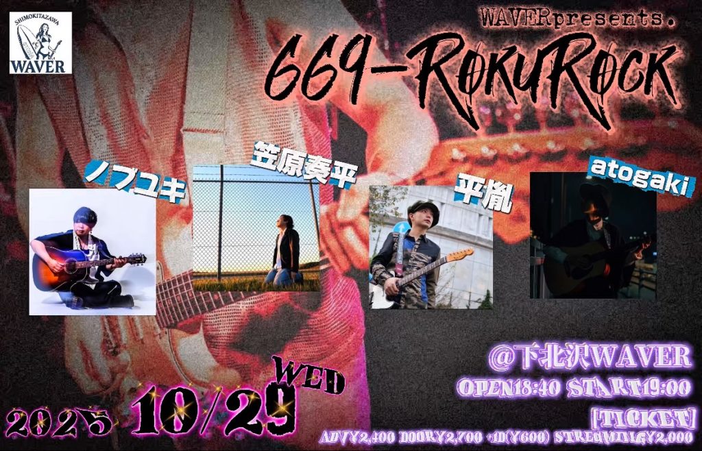 2025年9月2日 / 最終更新日時 : 2025年10月25日 ひとみ笹原 2025年10月 2025年10月29日(水) 『669-RokuRocK』 atogaki/笠原奏平/平胤/ノブユキ/他 18:40 / 19:00 adv¥2,400 / door¥2,700 各+drink代別 streaming ticketはこちらをご覧下さい。 FacebookXBlueskyHatenaCopy