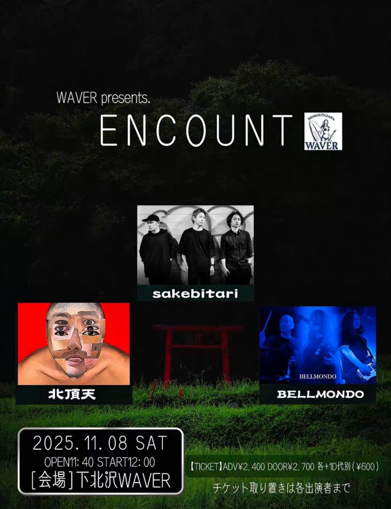 2025年9月27日 / 最終更新日時 : 2025年10月15日 ひとみ笹原 2025年11月 2025年11月08日(土)《day》 『ENCOUNT』 BELLMONDO/北頂天/sakebitari 11:40 / 12:00予定 adv¥2,400 / door¥2,700 各+drink代別 FacebookXBlueskyHatenaCopy