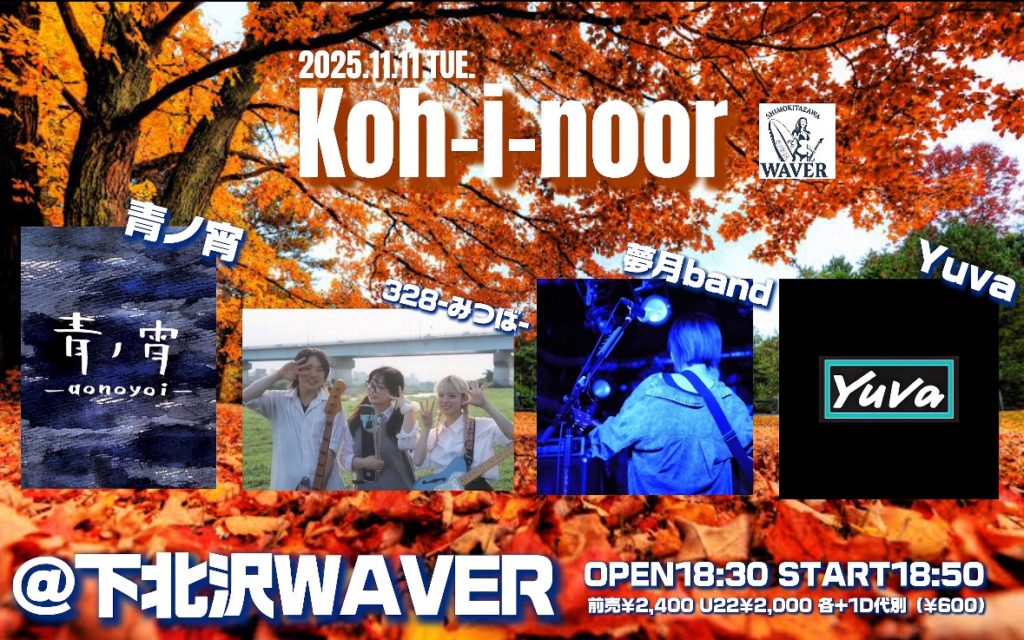 2025年10月1日 / 最終更新日時 : 2025年10月28日 ひとみ笹原 2025年11月 2025年11月11日(火) 『Koh-i-noor』 Yuva/夢月band/328-みつば-/青の宵 18:30 / 18:50 adv¥2,400 / door¥2,900 / U22¥2,000 各+drink代別 FacebookXBlueskyHatenaCopy