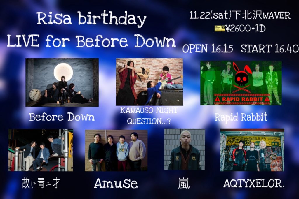 2025年10月1日 / 最終更新日時 : 2025年10月1日 ひとみ笹原 2025年11月 2025年11月22日(土)《night》 『Risa birthday LIVE for Before Down』 KAWAUSO NIGHT QUESTION…?/Rapid Rabbit/故に青二才/Amuse/嵐/AQTYXELOR. 16:15 / 16:40 adv¥2,600 / door¥TBA 各+drink代別 FacebookXBlueskyHatenaCopy