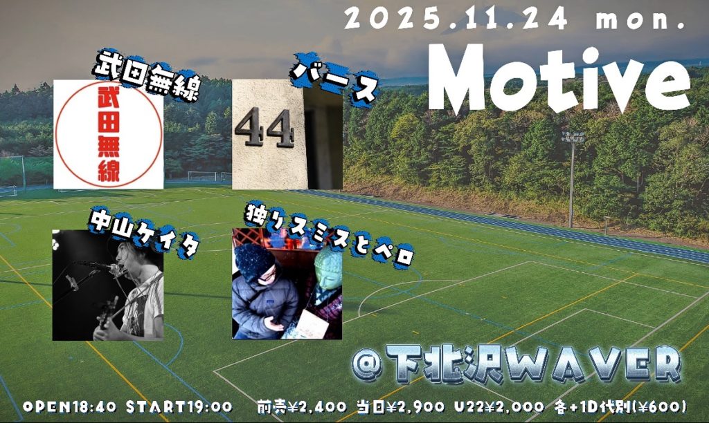 2025年10月2日 / 最終更新日時 : 2025年11月13日 ひとみ笹原 2025年11月 2025年11月24日(月祝)《night》 『Motive』 バース/スミスとペロ/中山ケイタ/武田無線 18:40 / 19:00 adv¥2,400 / door¥2,900 各+drink代別 FacebookXBlueskyHatenaCopy