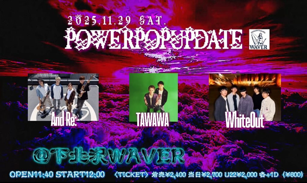 2025年10月2日 / 最終更新日時 : 2025年10月28日 ひとみ笹原 2025年11月 2025年11月29日(土)《day》 『POWERPOPUPDATE』 WhiteOut/TAWAWA/And Re; 11:40 / 12:00 adv¥2,400 / door¥2.700 / U22¥2,000 各+drink代別 FacebookXBlueskyHatenaCopy