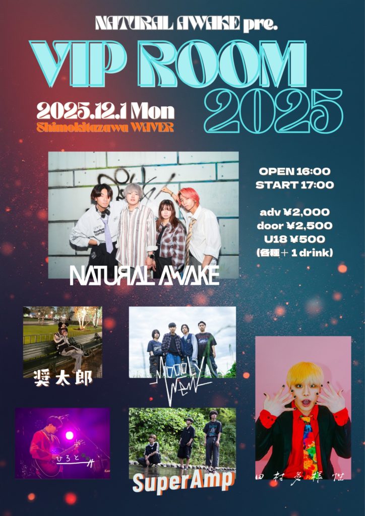 2025年11月8日 / 最終更新日時 : 2025年11月24日 ひとみ笹原 2025年12月 2025年12月01日(月) NATURAL AWAKE pre.『VIP ROOM 2025』 田村多様性/Super Amp/ひろと/Mooody Men/NATURAL AWAKE/(O.A)奨太郎/li> 16:00 / 16:30 adv¥2,000 / door¥2,500 / U18¥500 各+drink代別 FacebookXBlueskyHatenaCopy