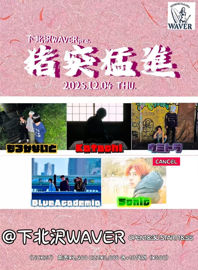 2025年11月9日 / 最終更新日時 : 2025年11月29日 ひとみ笹原 2025年12月 2025年12月04日(木) 『猪突猛進』 もるがないと/ウミトラ/BlueAcademia/Katachi 18:55 / 19:20 ※時間が変更になりました。(11/28現在) adv¥2,400 / door¥2,900 / U22¥2,000 各+drink代別 FacebookXBlueskyHatenaCopy