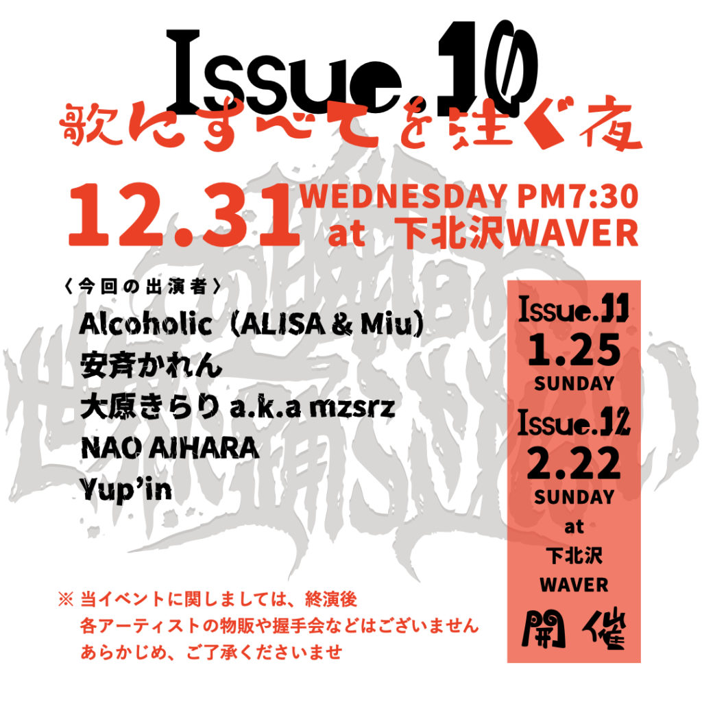 2025年11月23日 / 最終更新日時 : 2025年12月5日 ひとみ笹原 2025年12月 2025年12月31日(水)《night》 『この瞬間、世界に踊らされない。- Issue 10』 Alcoholic(ALISA&Miu)/ 安斉かれん / 大原きらり(mzsrz)/ NAO AIHARA / Yup’in 19:00 / 19:30 adv¥2,500 / door¥3,000 各+drink代別 ticketはこちらをご覧下さい。 FacebookXBlueskyHatenaCopy