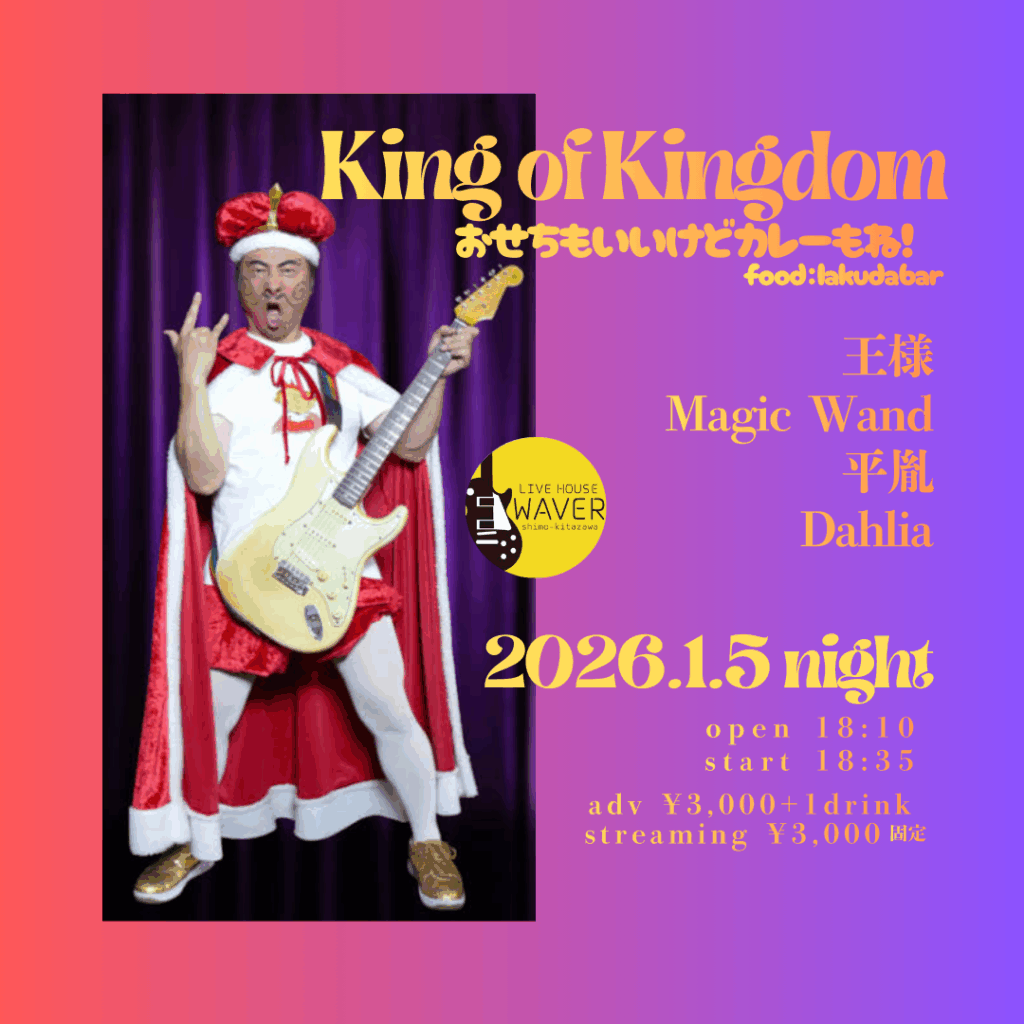 2025年12月14日 / 最終更新日時 : 2025年12月14日 ひとみ笹原 2026年01月 2026年01月05日(月)《night》 『King of Kingdom〜おせちもいいけどカレーもね!』 王様/Magic Wand/平胤/Dahlia 18:10 / 18:35 adv¥3,000 / door¥3/500 各+drink代別 / streaming¥3,000 streaming ticketはこちらをご覧下さい。 FacebookXBlueskyHatenaCopy
