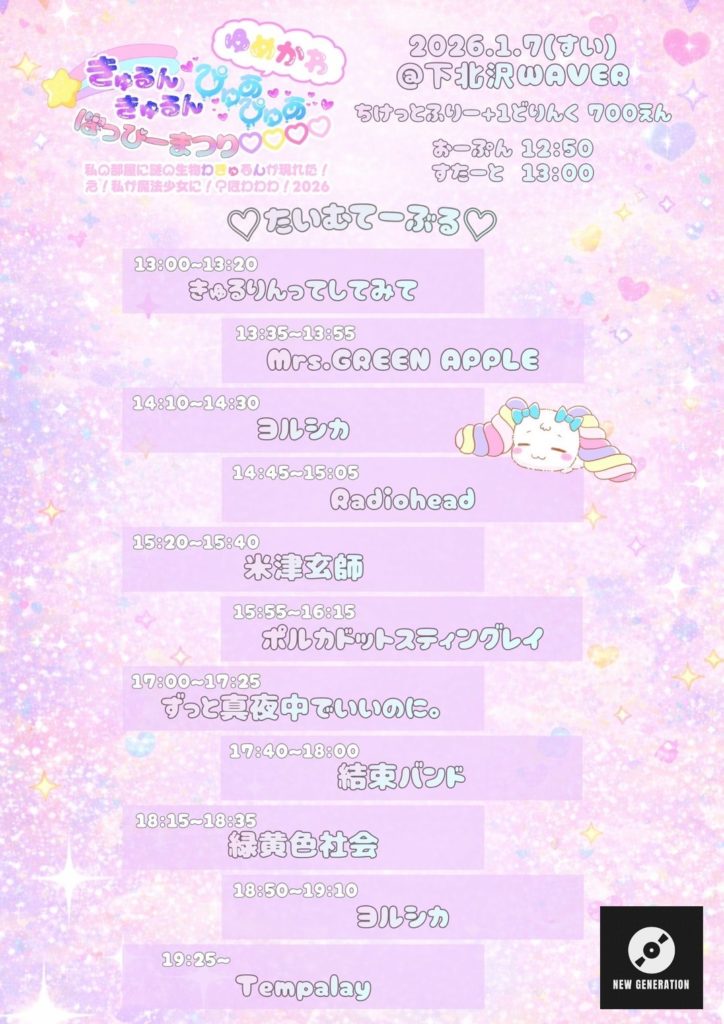 2025年12月14日 / 最終更新日時 : 2026年1月5日 ひとみ笹原 2026年01月 2026年01月07日(水) 専修大学 NewGeneration『きゅるんきゅるん ぴゅあぴゅあ はっぴーまつり』 12:50 / 13:00 oor¥FREE +drink代別 FacebookXBlueskyHatenaCopy