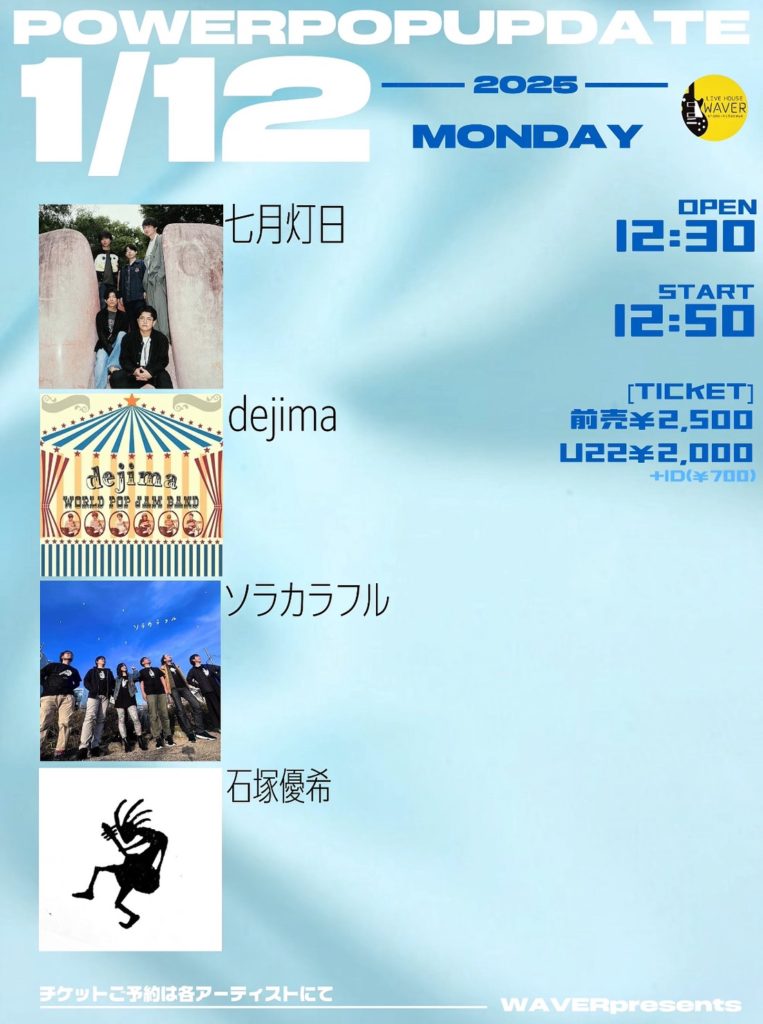 2025年12月14日 / 最終更新日時 : 2025年12月14日 ひとみ笹原 2026年01月 2026年01月12日(月祝) 『POWERPOPUPDATE』 dejima/ソラカラフル/七月灯日/石塚優希 12:30 / 12:50 adv¥2,400 / door¥2,900 / U22¥2,000 各+drink代別 FacebookXBlueskyHatenaCopy