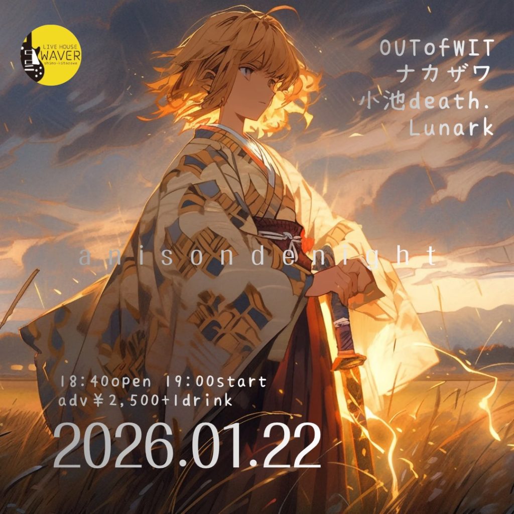 2026年1月7日 / 最終更新日時 : 2026年1月7日 ひとみ笹原 2026年01月 2026年01月22日(木) 『anisondenight』 OUTofWIT/ナカザワ/小池death./Lunark 18:40 / 19:00 adv¥2,500 / door¥2,800 各+drink代別 FacebookXBlueskyHatenaCopy