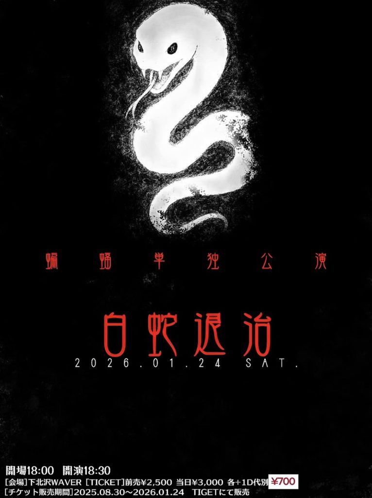 2026年1月7日 / 最終更新日時 : 2026年1月8日 ひとみ笹原 PICK UP 2026年01月24日(土)《night》 蝙蝠単独公演『白蛇退治』 蝙蝠 18:00 / 18:30 adv¥2,500 / door¥3,000 各+drink代別 ticketはこちらをご覧下さい。 FacebookXBlueskyHatenaCopy