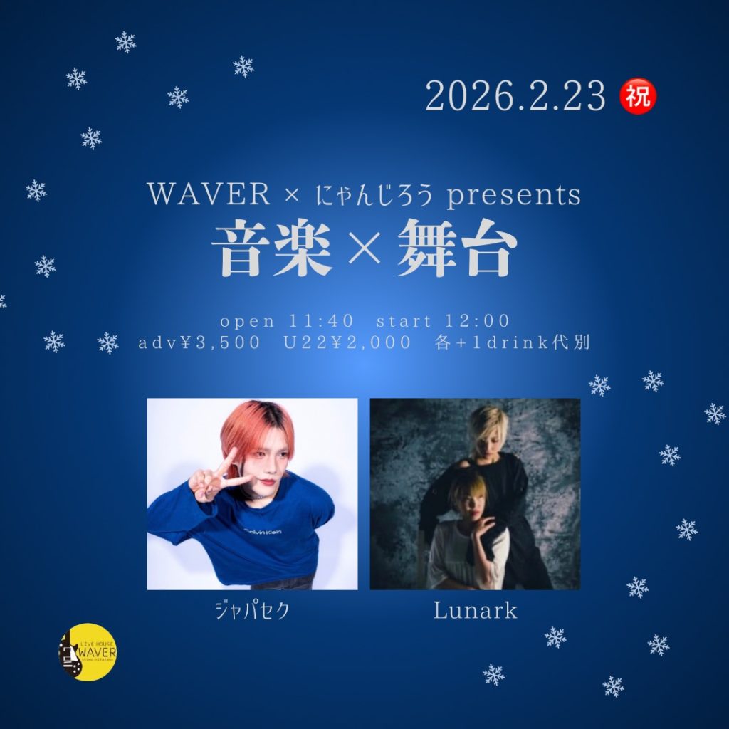 2026年2月1日 / 最終更新日時 : 2026年2月1日 ひとみ笹原 2026年02月 2026年02月23日(月) WAVER×にゃんじろう presents『音楽×舞台』 Lunark×ジャパセク 11:40 / 12:00 U22¥2,000 / adv¥3,500 / door¥4,000 各+drink代別 FacebookXBlueskyHatenaCopy