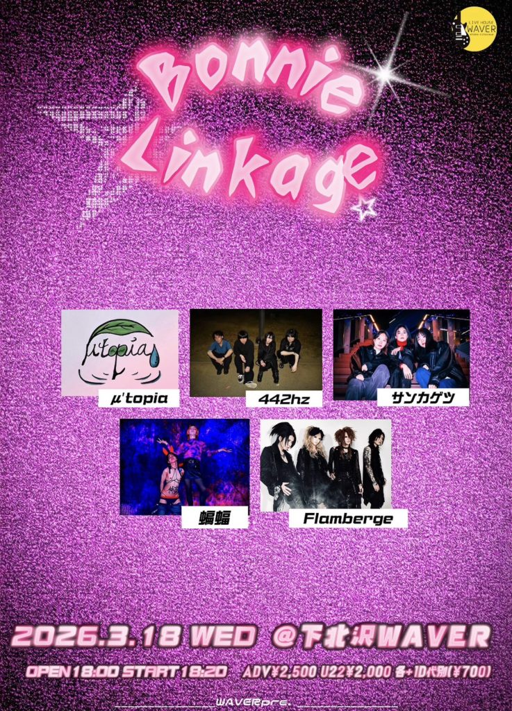 2026年2月4日 / 最終更新日時 : 2026年2月4日 ひとみ笹原 2026年03月 2026年03月18日(水) 『Bonnie Linkage』 442hz/Flamberge/μ’topia/蝙蝠/サンカゲツ 18:00 / 18:20 adv¥2,500 / door¥3,000 / U22¥2,000 各+drink代別 FacebookXBlueskyHatenaCopy