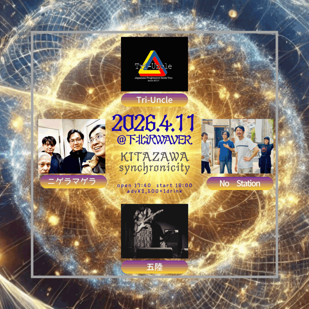 2026年3月15日 / 最終更新日時 : 2026年3月15日 ひとみ笹原 2026年04月 2026年04月11日(土) 『KITAZAWA synchronicity』 Tri-Uncle/ニゲラマゲラ/五陸/No Station 17:40 / 18:00 ADV¥2,500 / DOOR¥3,000 各+drink代別 FacebookXBlueskyHatenaCopy