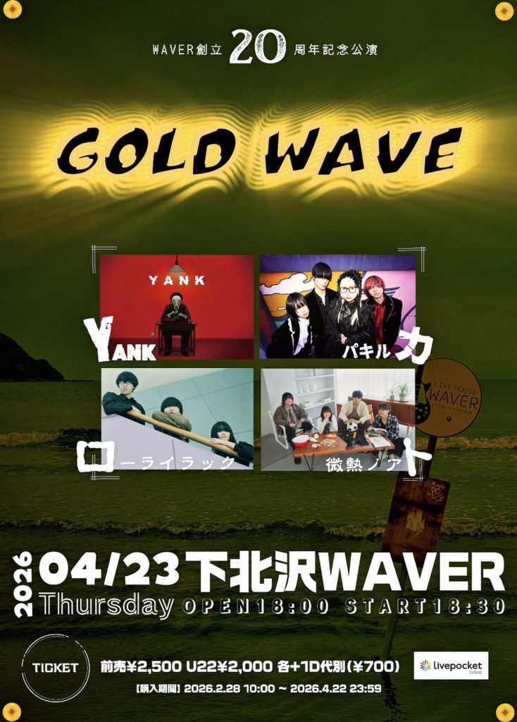 2026年3月25日 / 最終更新日時 : 2026年3月25日 ひとみ笹原 2026年04月 2026年04月23日(木) 『GOLD WAVE』 YANK/パキルカ/ローライラック/微熱ノアト 18:00 / 18:30 ADV¥2,500 / DOOR¥3,000 / U22¥2,000 各+1drink代別 ticketはこちらをご覧下さい。 FacebookXBlueskyHatenaCopy